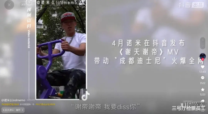 简略本年四月的时候,广场出现了一个叫#成皆迪士尼的热搜。说唱歌手诺米比赛淘汰后,创作了一首名为《谢天谢帝》的歌曲,用来diss不招供我方实力的评委谢帝。因为歌词“diss你”和“迪士尼”谐音,原MV里的拍摄所在被网友戏称为“成皆迪士尼”。