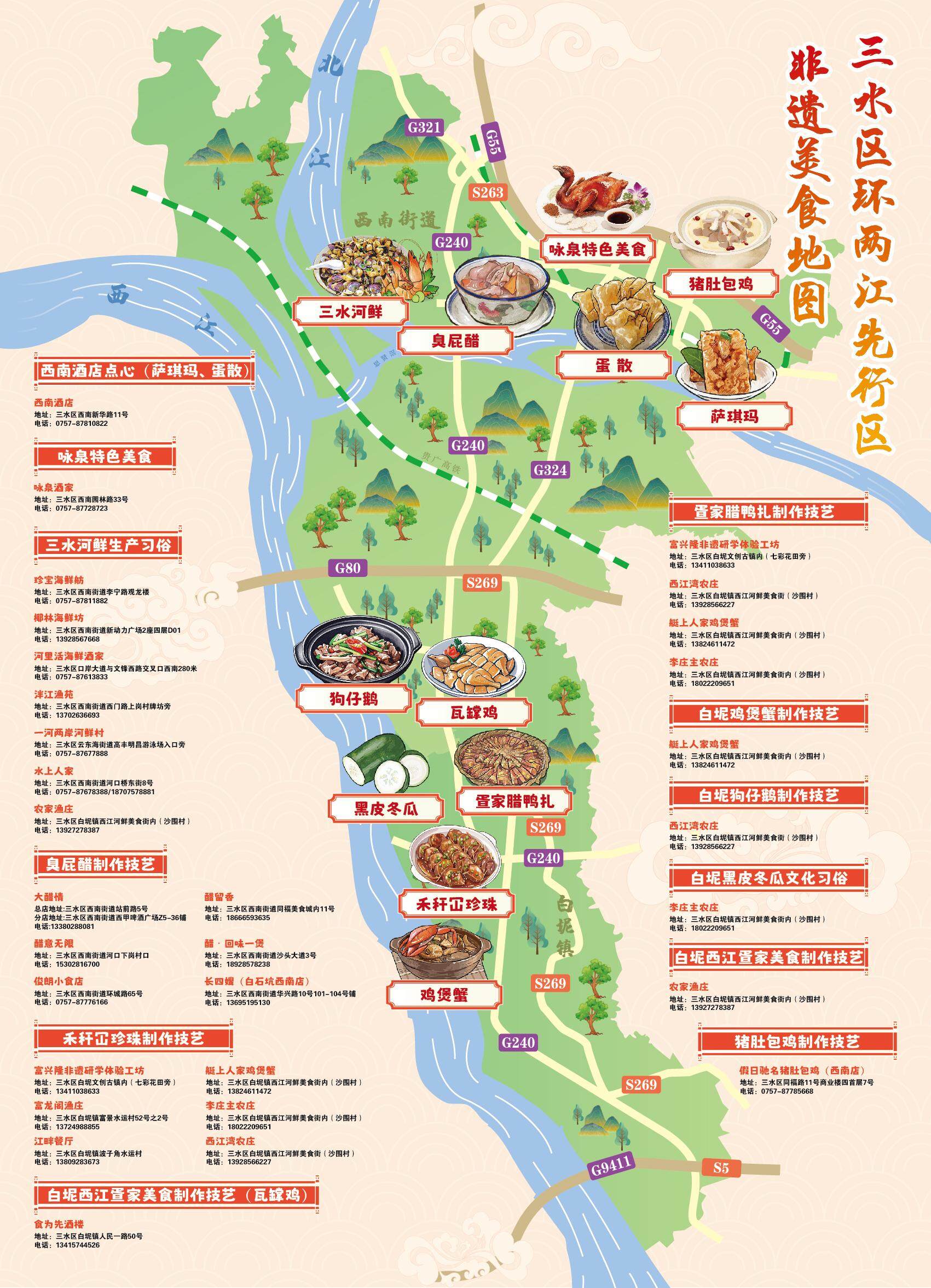 为擦亮“材出三水,鲜在三水”的金字牌号,三水以好意思食打头阵,厚爱发布三水西江“非遗一桌菜”和《环两江先行区非遗好意思食舆图》,为腊鸭扎、禾秆冚珍珠、鸡煲蟹等疍家非遗好意思食披发官方认证。