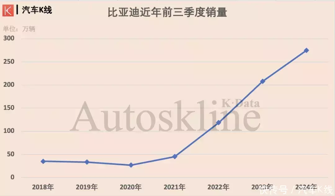 销量端,本年前三季度比亚迪累计销量为274.79万辆,质的更变相同出现时2022年,这一年前三季度的销量为118.51万辆,相较2021年的45.27万辆径直翻番。