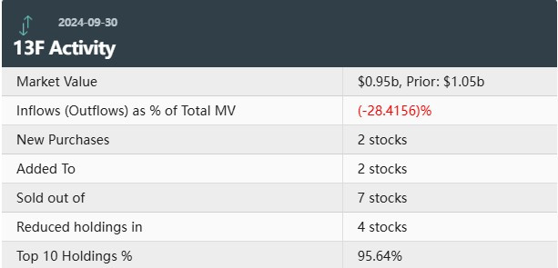 据统计,凯雷第三季度捏仓总市值为9.5亿好意思元,较上一季度的10.5亿好意思元下落9.5%。凯雷在第三季度的捏仓组合中新增了2只个股,增捏了2只个股。同期,凯雷还减捏了4只个股,清仓了7只个股。其中前十大捏仓方向占总市值的95.64%。