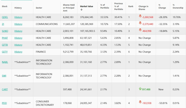 在前五大重仓股中,窥得儿医药(QDEL.US)位列第一,捏仓约826万股,捏仓市值约3.77亿好意思元,占投资组合比例为33.53%,较上季度捏仓数目大幅削减28.30%。