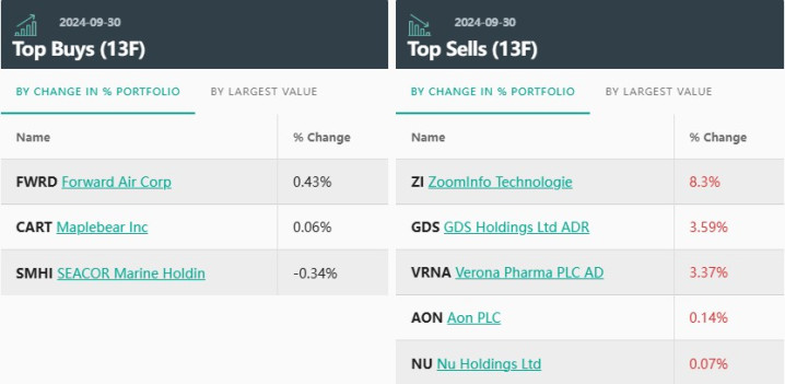 前五大卖出方向区别是:ZoomInfoTechnologies、万国数据、维罗纳制药、怡安保障、NuHoldings。