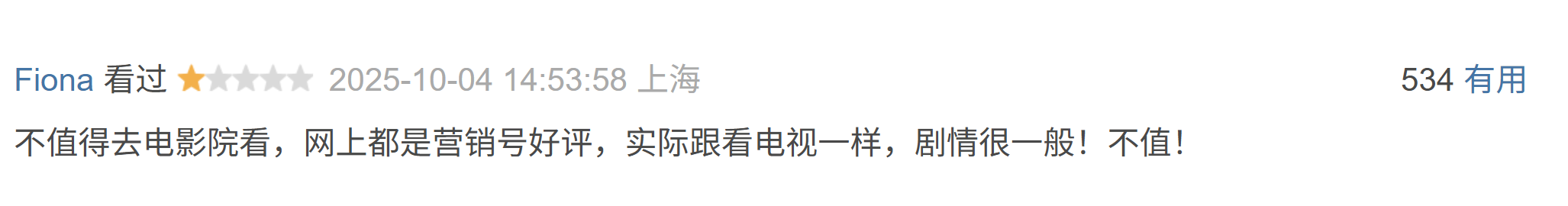 还有“不值得去电影院看,网上齐是营销号好评,实质跟看电视一样,剧情很一般!不值!”
