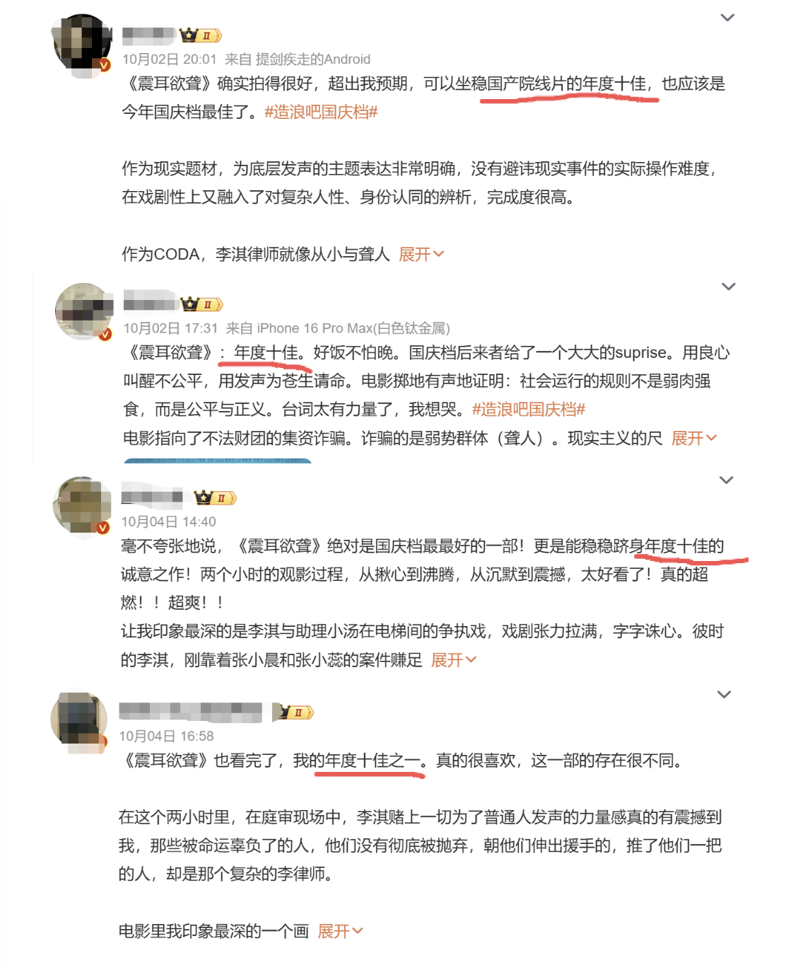出于各式千般的原理,《震耳欲聋》的首映礼不但奏效作念到零差评,甚而“年度十佳”的说法就看到了几十条!险些成了电影调解的对外宣传标语。