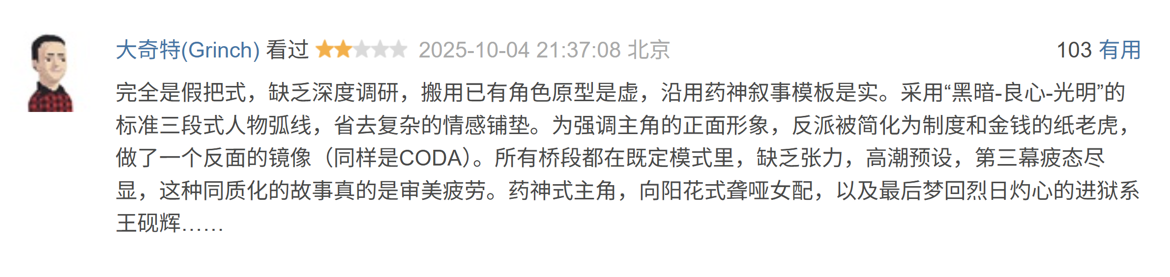 完全是假把式,缺少深度调研,搬用已有变装原型是虚,沿用药神叙事模板是实。选拔“暗澹-良心-光明”的程序三段式东谈主物曲线,省去复杂的情感铺垫。为强调主角的正面形象,邪派被简化为轨制和财富的纸老虎,作念了一个反面的镜像(一样是CODA)。总计桥段齐在既定模式里,缺少张力,高涨预设,第三幕疲态尽显,这种同质化的故事确切是审好意思疲顿。药神式主角,晨曦名目聋哑女配,以及临了梦回烈日灼心的进狱系王砚辉…