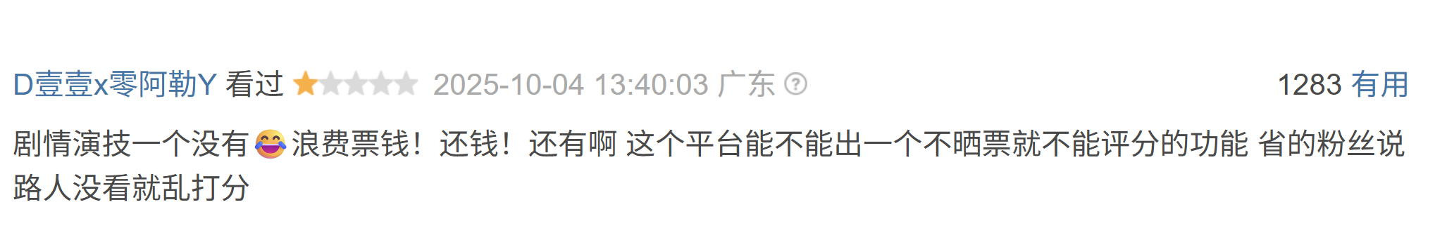 有一星不雅众高呼摧毁票钱、还钱,并命令“平台能不可出一个不晒票就不可评分的功能”