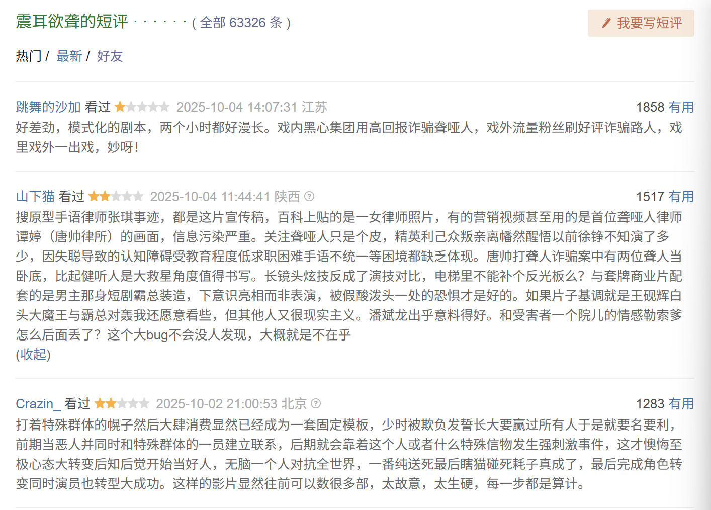 另外两条差评,也在吐槽电影“信息浑浊严重、柔软聋哑东谈主仅仅个皮,精英自私众叛亲离的戏码不知演了若干”、“打着特别群体的幌子然后鼎力耗尽昭彰仍是成为一套固定模板,太特意,太生硬,每一步齐是觉得。”