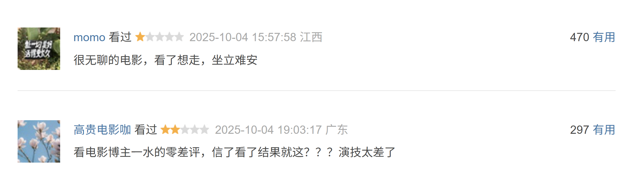 以及“看电影博主一水的零差评,信了看了成果就这?演技太差了。”