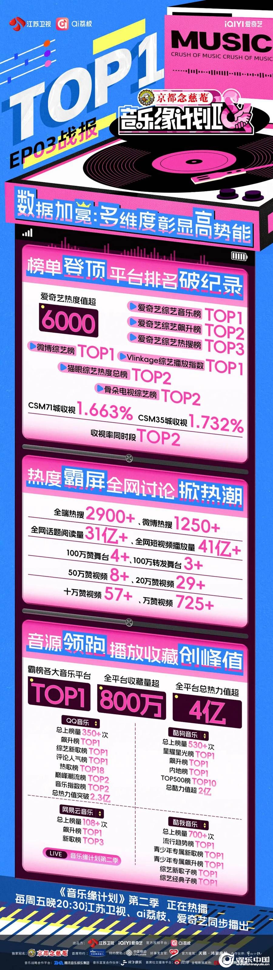 歌曲发布48小时总上榜次数累计超1680次,保藏量累计破800万,全平台总热力值超4亿,领跑QQ音乐飙升榜、综艺新歌榜、批驳东说念主气榜,酷狗音乐星耀星光榜、飙升榜、内地榜等多个榜单。节目CSM71城收视1.663%,CSM35城收视1.732%,位列省级卫视同期段TOP2。外交平台话题度平直拉满,揽获#周深刘宇宁跳了一段爱的华尔兹#、#刘宇宁思要刘宇宁赢得#、#周深争取一年健身三四次#、#第一次见薛之谦选歌这样纠结#等全网热搜2900+个,其中微博热搜超1250+个,全网关系话题阅读量崎岖31亿,短视频播放量超41+亿。