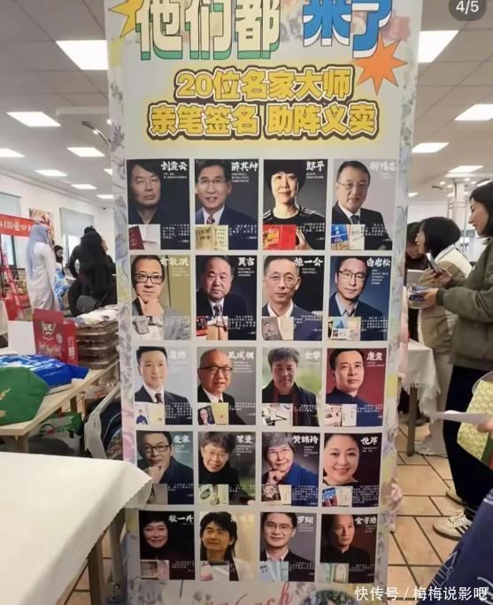这次义卖活动,董卿不错说是终点引东谈主素雅,因为她制作了一个海报,上头印着20位有名作者的像片。