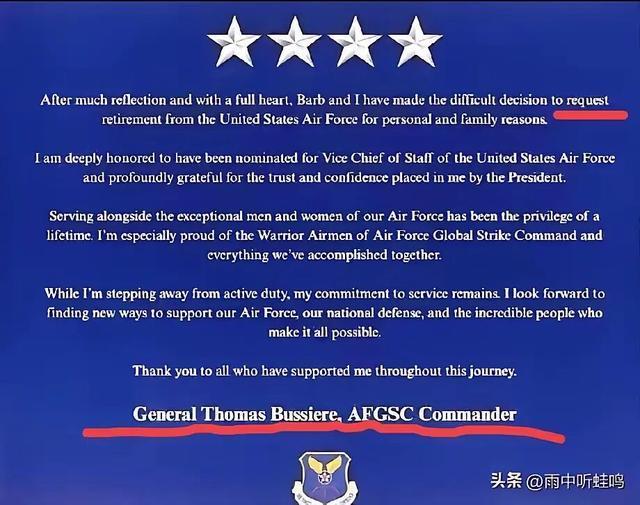 好意思国空军内行打击司令部司令托马斯·布西尔上将的退役声明,像一颗无声的炸弹在五角大楼引爆。就在好意思国防长赫格塞斯向三军将领发出“不招供就辞职”的临了通牒后第二天,这位掌合手好意思国空基和陆基核力量的重要东谈主物文书“出于个东谈主和家庭原因”退役。