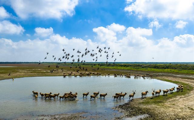 10月11日,在江苏东台便条泥湿地,候鸟遨游,成群野生麋鹿适意分离,一片东说念主与当然调解共生的生态好意思景(无东说念主机像片)。