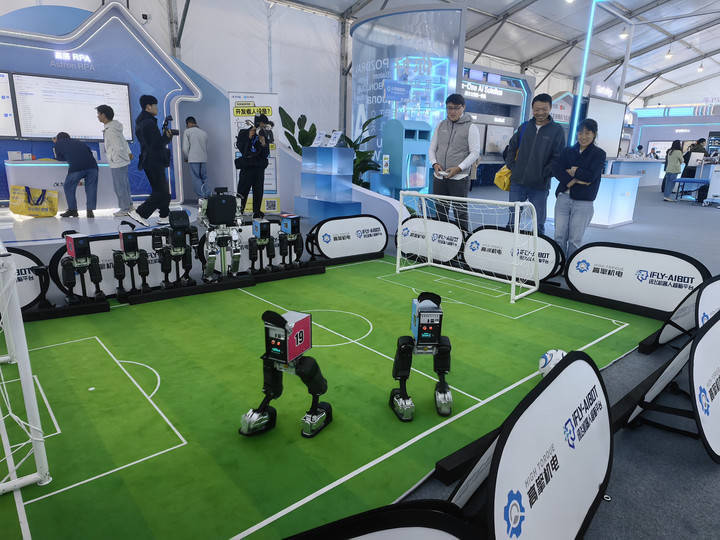 机器东谈主在第八届天下声博会上进行足球比赛(汪海月 摄)推动AI工夫走向普惠