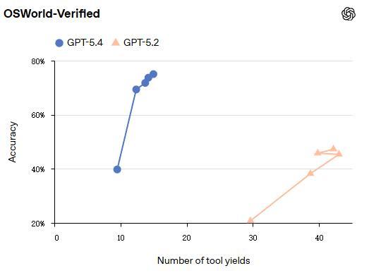 GPT-5.4 在盘算推算机使用基准测试中阐扬优异。在 OSWorld-Verified 基准(通过截图和键盘鼠标操作 PC 桌面环境)上,GPT-5.4 罢了了 75.0% 的奏效劳,远超 GPT-5.2 的 47.3%,致使朝上东说念主类阐扬(72.4%)。