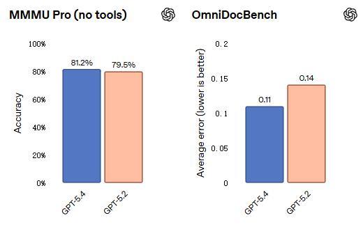 视觉感知智商方面,GPT-5.4 在 MMMU-Pro 视觉判辨与推理测试中取得 81.2% 的奏效劳,优于 GPT-5.2 的 79.5%。在 OmniDocBench 文档判辨测试中,GPT-5.4 的平均无理率降至 0.109(GPT-5.2 为 0.140)。
